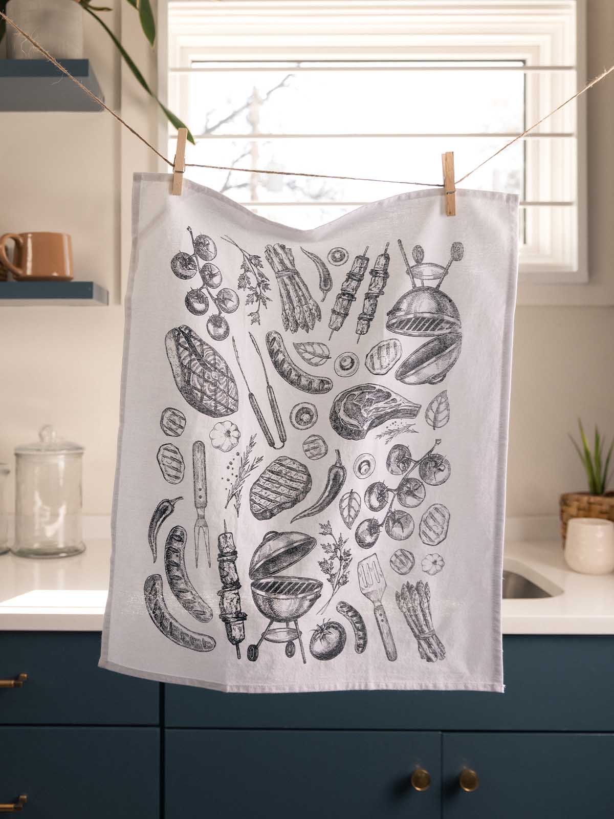 Fire up the grill! The Grilling Tea Towel features illustrated grilling tools, steaks, and grills in soft black watercolor-style ink on a crisp white background. It’s both functional and thoughtfully designed.