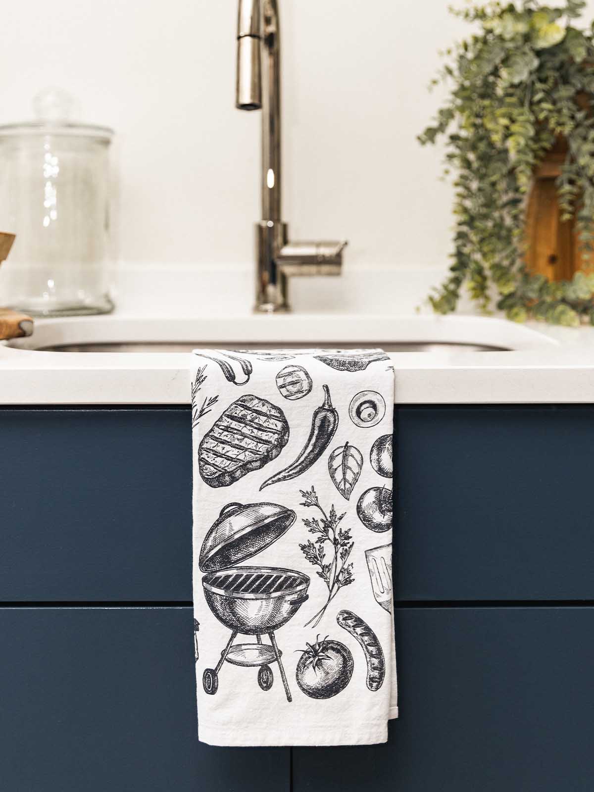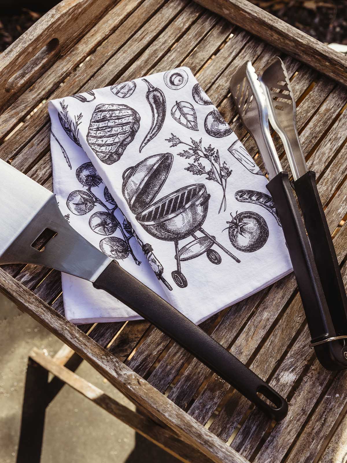 Grill themed tea towel BBQ kitchen towel grilling tools illustration cotton tea towel